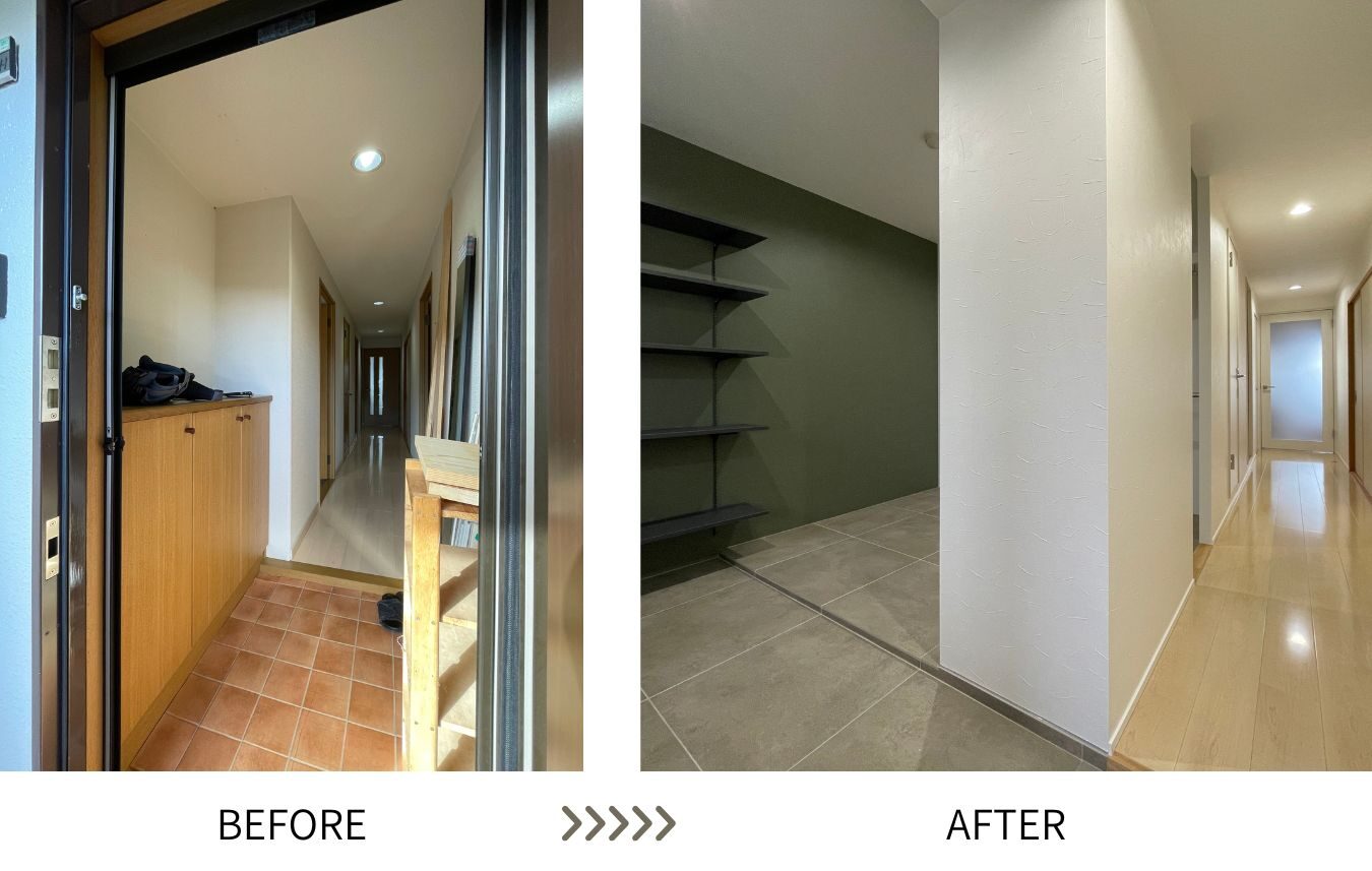 狭かった玄関と玄関横の洋室を解体して間口を広げ、広々とした土間収納空間に生まれ変わりました!